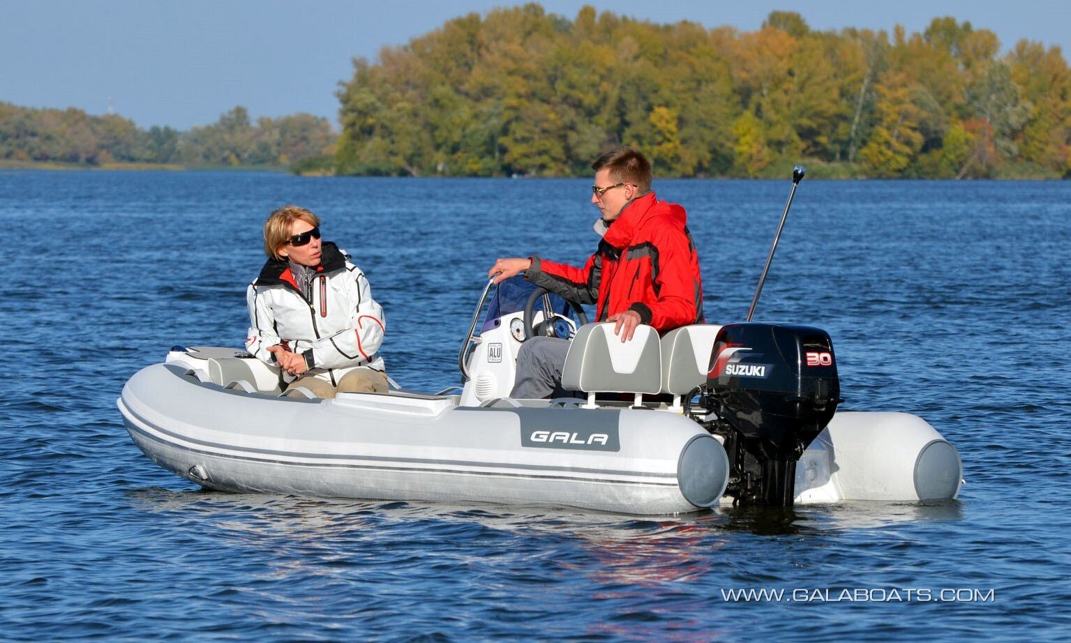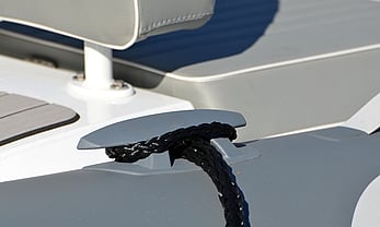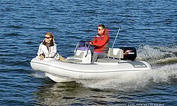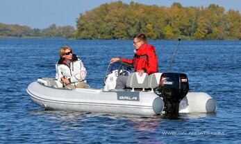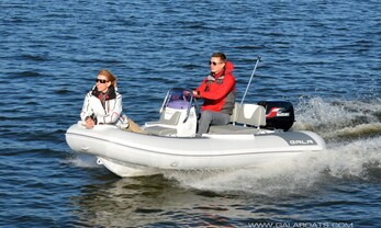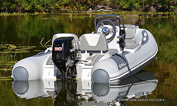 Medium-V, powder-coated aluminium self-bailing hull with «GALA TABS», motor well, rear splash deflectors, keel protector, zinc anode.